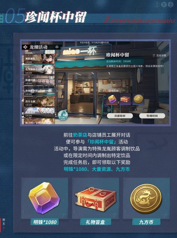 活动中,导演需为特殊龙胤顾客调制饮占或在限定时间内调制出特定饮品,完成任务后,即可领取以下奖励:明铢*1080、大量资源、九方币