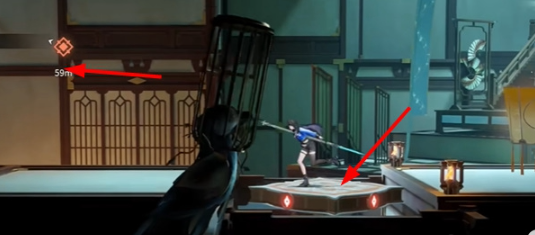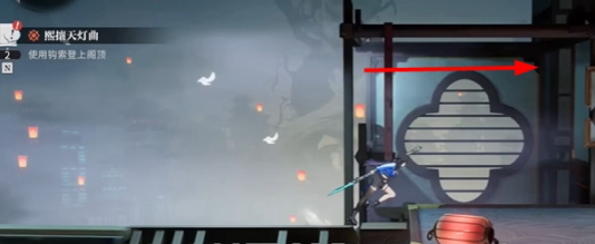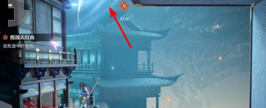 2、根据任务图标进行前进,使用钩索登上阁顶。
