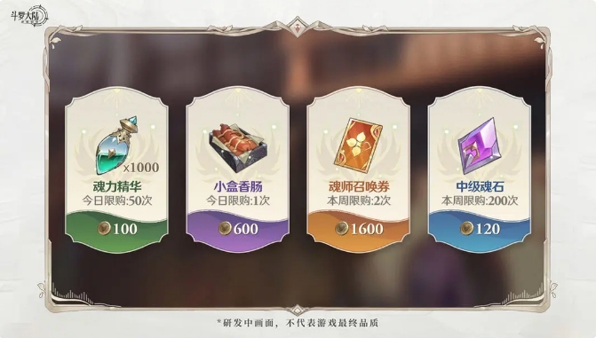斗魂币可在“斗魂商店”购买各类资源,初期建议优先购买小盒香肠,体力可获取各项资源、快速提升战力。另外魂力精华、魂师召唤券、中级魂石也是较珍贵的资源。