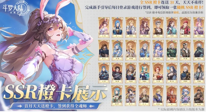 5、另外玩家只需首月连续登录游戏并完成签到就能获得全魂师奖励,全SSR橙卡连送31天。