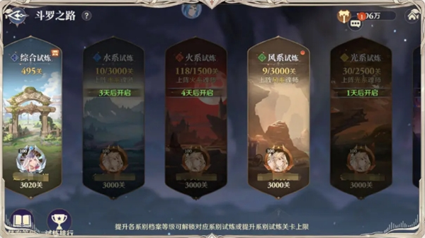 斗罗之路可分为综合试炼、五系试炼,提升各系别的档案等级可用来提升对应试炼关卡的上限。综合试炼主要产出魂师碎片,五系试炼产出召唤券、魂晶,两类试炼都要求我们尽可能提升队伍战力才能持续推进。