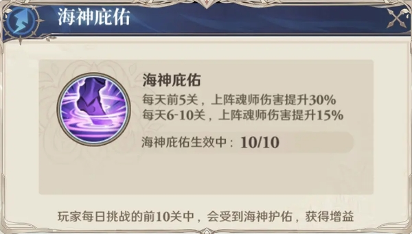 每天挑战的前10关会得到海神庇佑,大幅提升上阵魂师伤害,卡关的朋友们可以每天尝试调整阵容、持续推进。