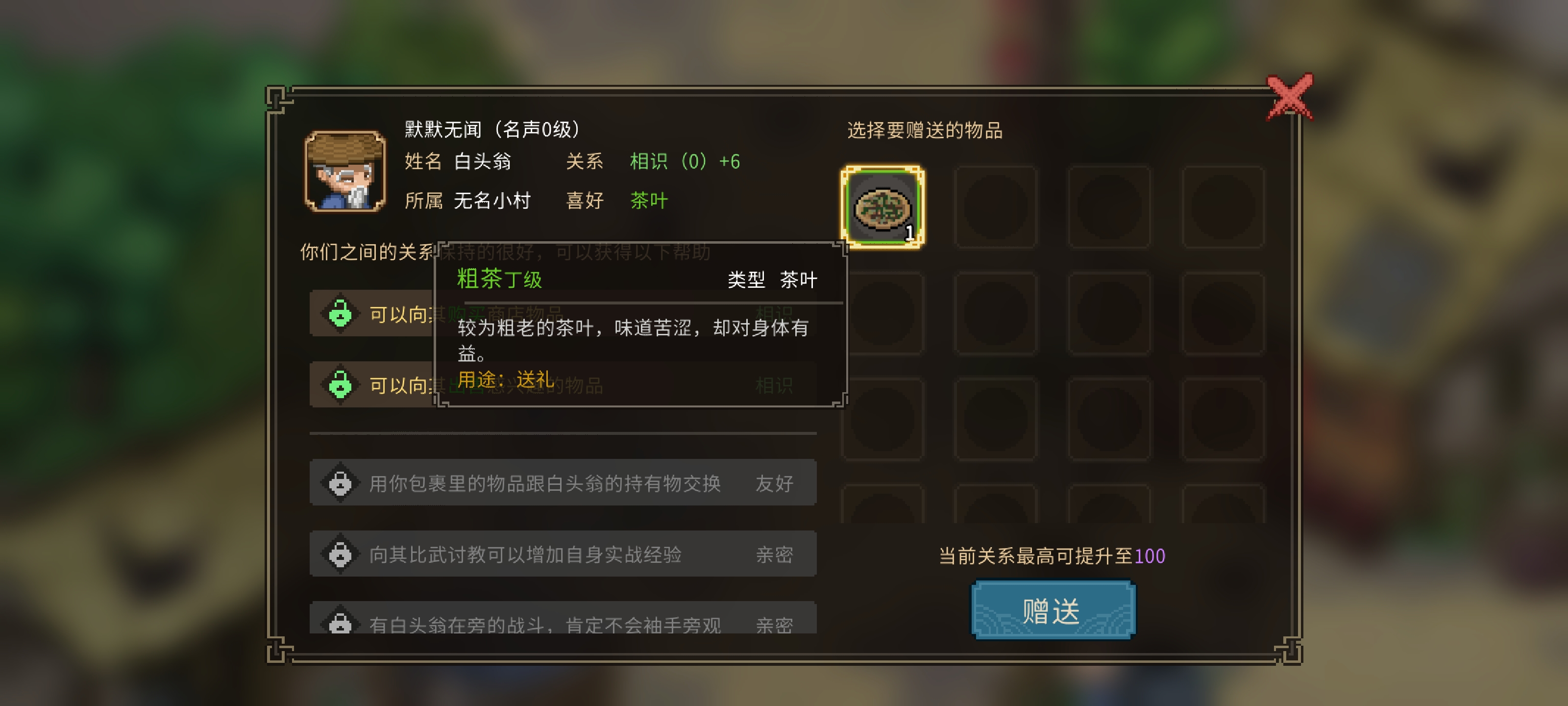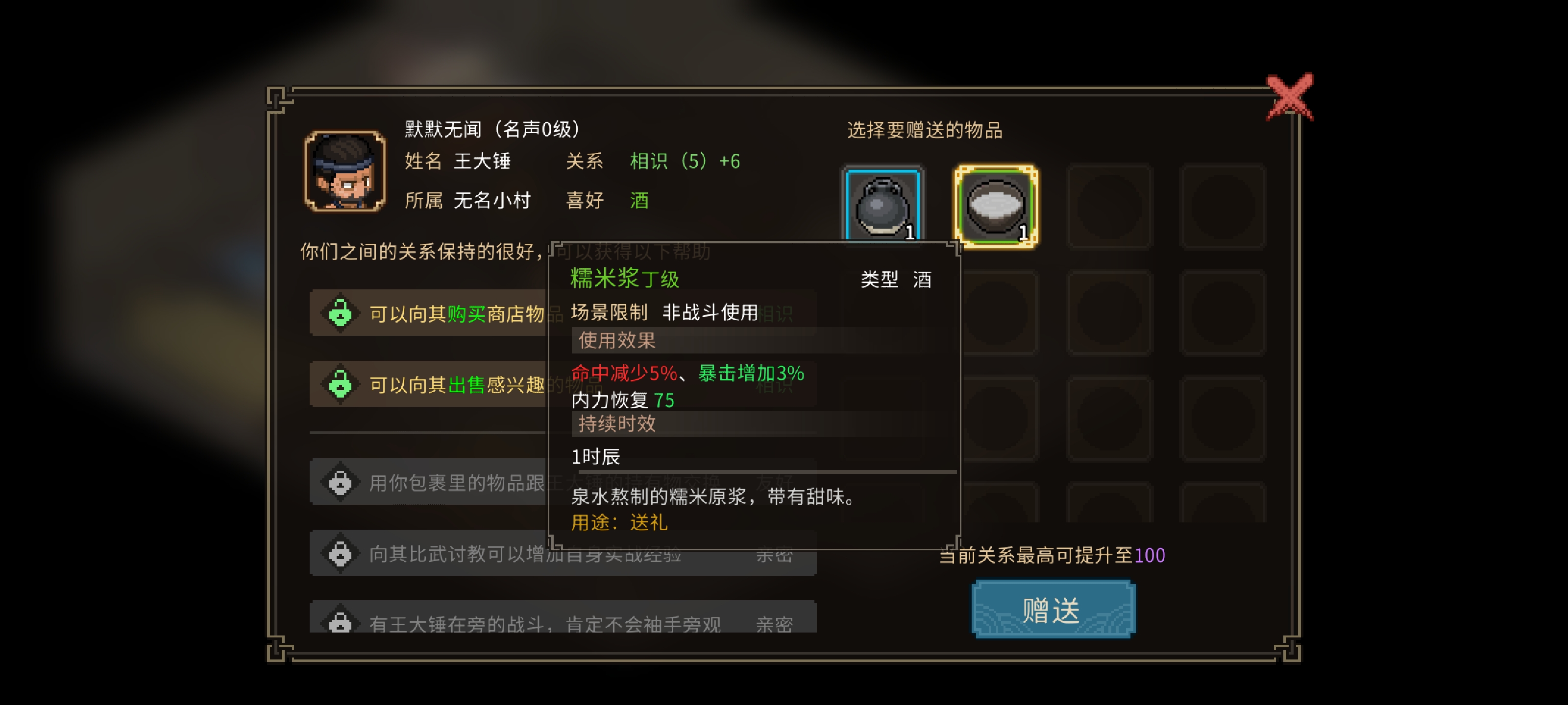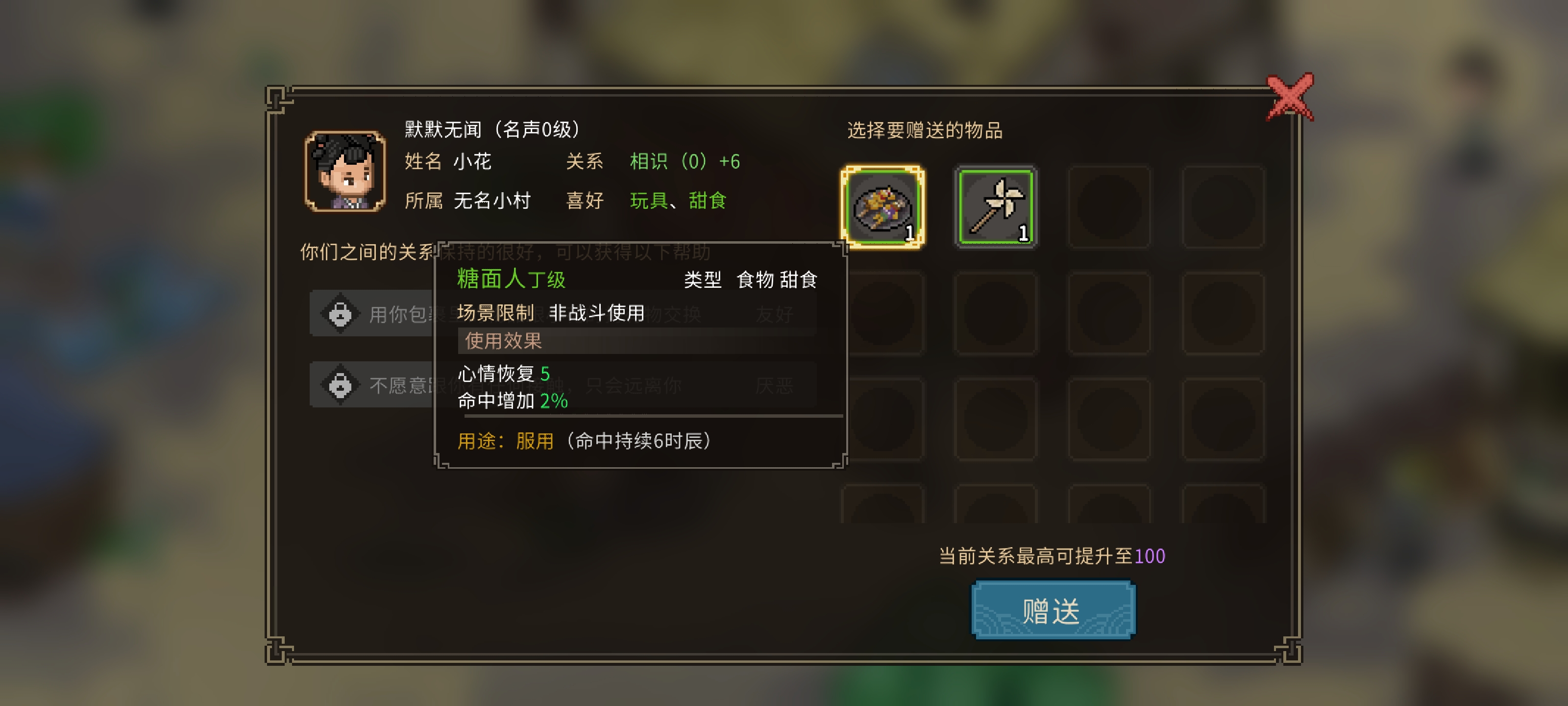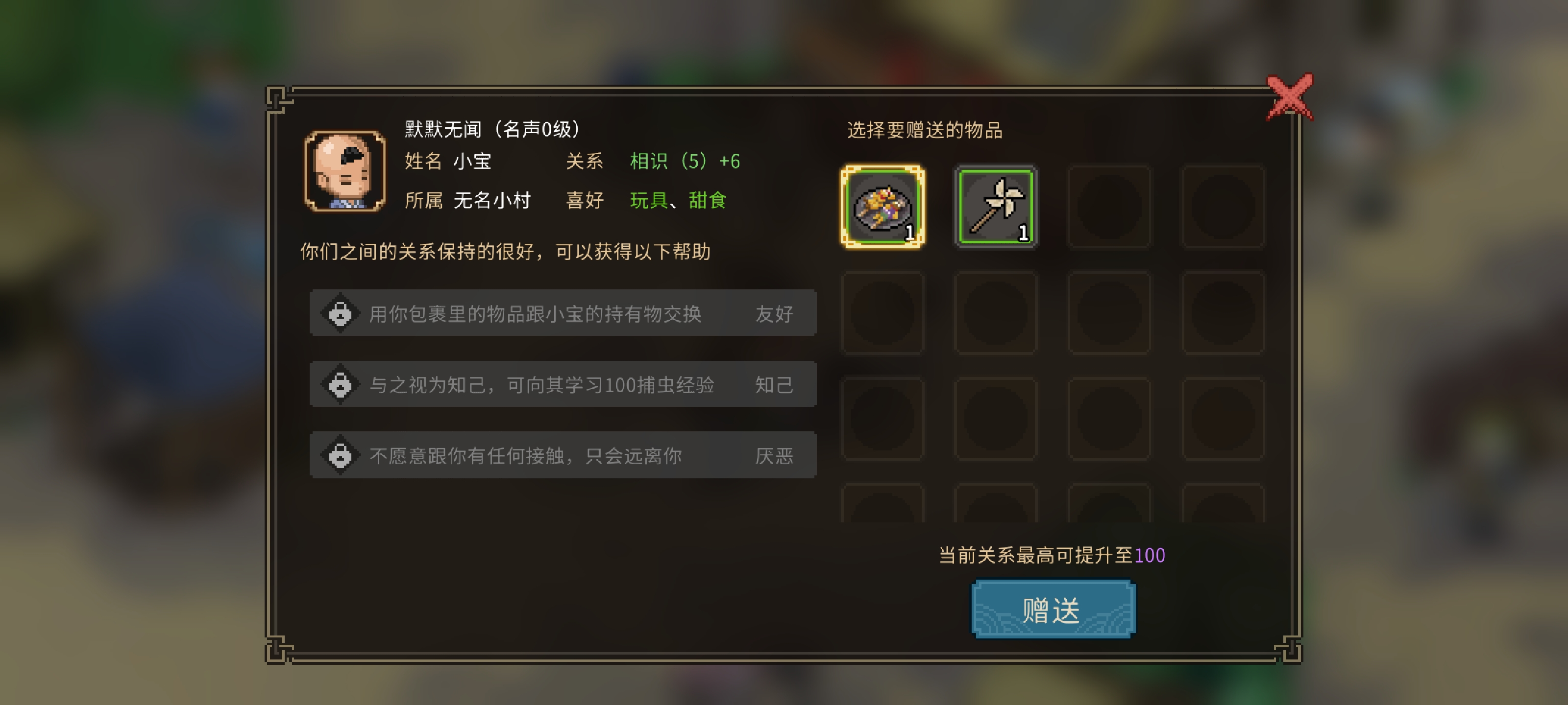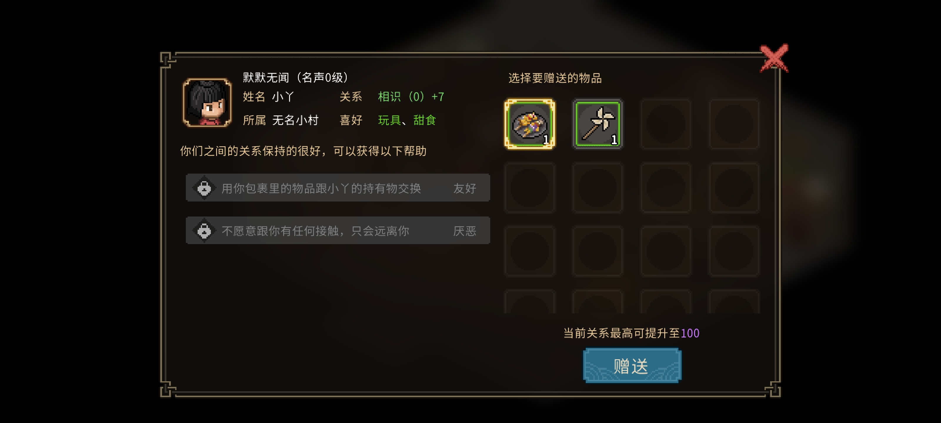 大侠立志传是一款集合了复古像素风格与开放世界元素的武侠角色扮演游戏,游戏中大家攻略NPC可以按照他们的喜好去送礼,接下来给大家带来了《大侠立志传》npc喜好物品(好感度)送礼攻略,一起来看看吧!