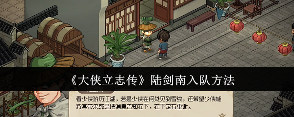 大侠立志传陆剑南怎么入队?在大侠立志传游戏中随着玩家等级的提升会领取到任务难度也会提升,想顺利完成任务获得奖励,玩家可以选择组队的方法去完成。下面小编给大家整理了大侠立志传陆剑南入队方法,一起看看吧。