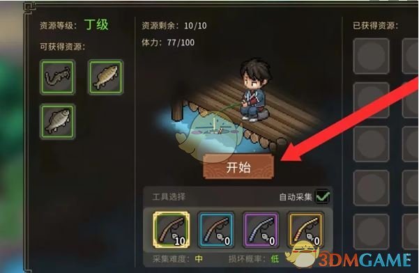 2、点选装备钓鱼竿,勾选自动采集,点击“开始”即可自动垂钓。