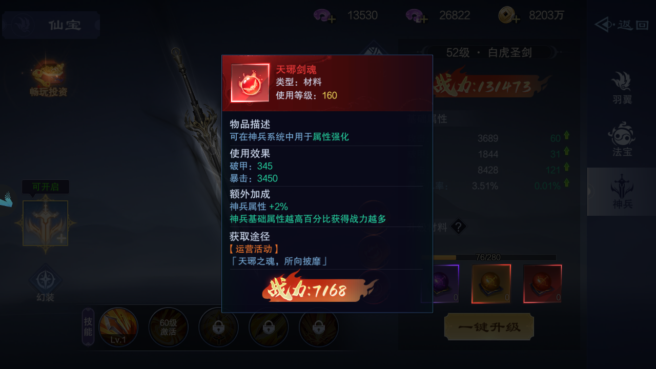 【天琊剑魂】增加暴击和破甲,额外属性:神兵属性百分比加成,法宝基础属性越高百分比获得战力越多,可以通过运营活动等获得