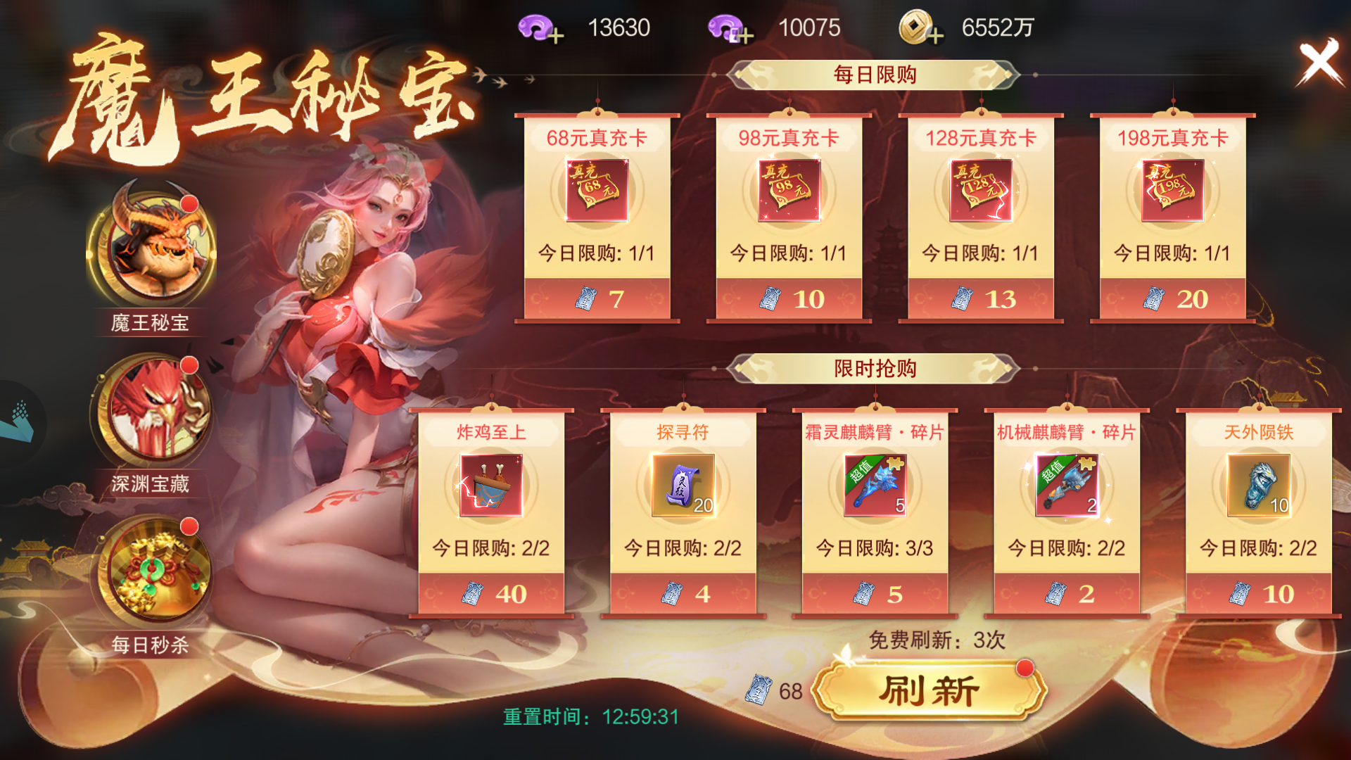 使用【世界魔王令牌】兑换68、98、128、198元档位的真充卡,每日限购1份。