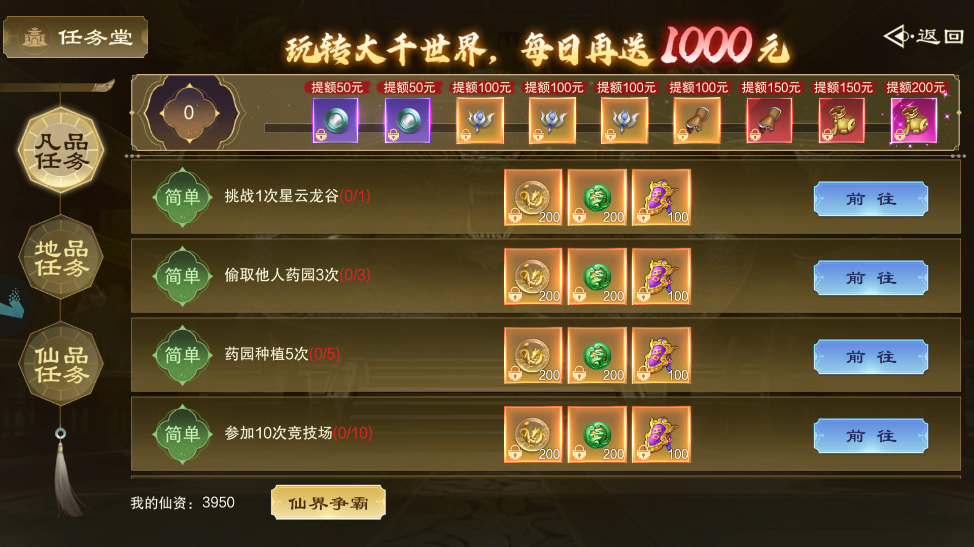 分凡品、地品、仙品三个档位的任务,难度分别从易到难。