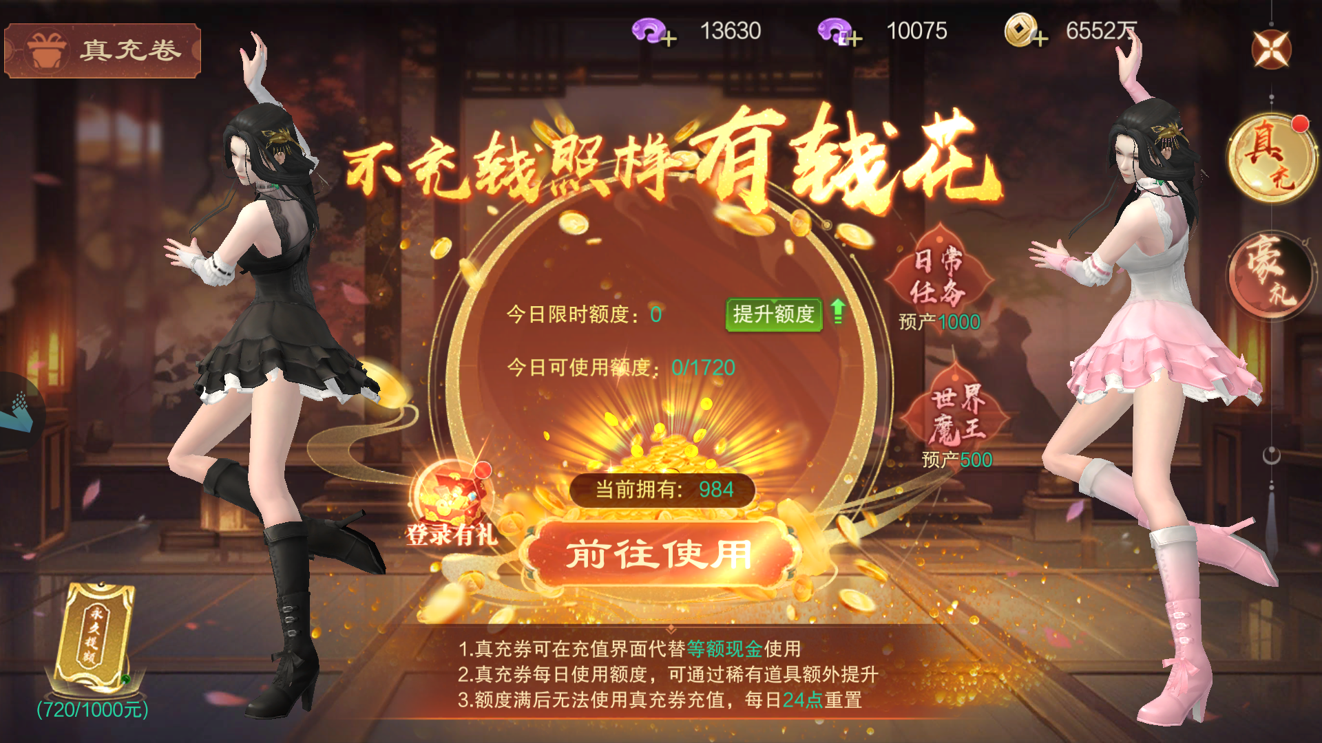 打魔王、做日常任务得真充券,获得的真充券与RMB充值等额,可直接在充值界面使用,享受与真实充值相同的待遇。无论是购买高级道具、提升VIP等级还是参与限时活动,真充券都能让你无需花费真金白银,即可享受游戏内的种种便利。