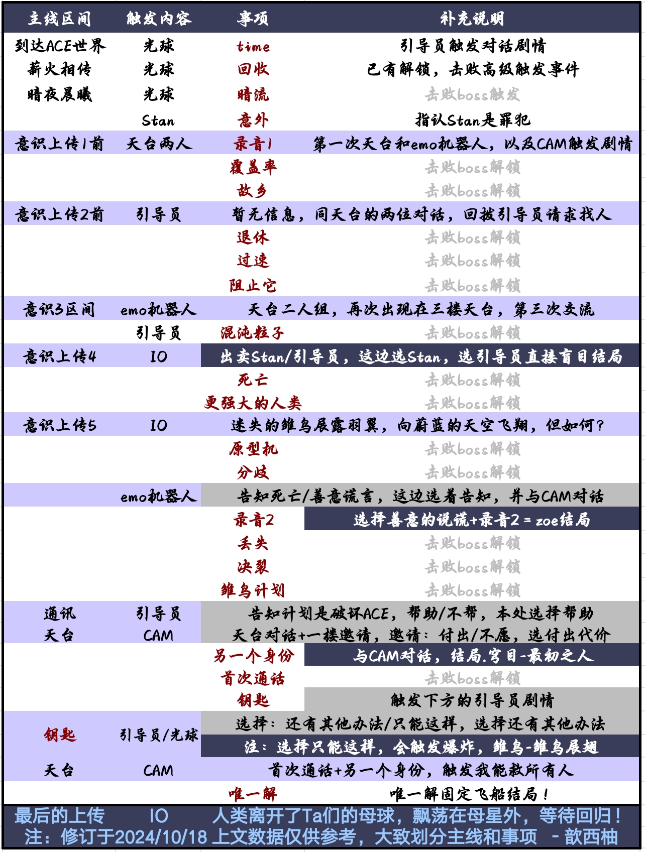 后续的意识并联,雏鸟和飞船结局需要你收集充分的事项,了解这个世界的事情,掌握权力(CAM),知识(光球),自我(引导员),利用它们来推进你想完成的结局!