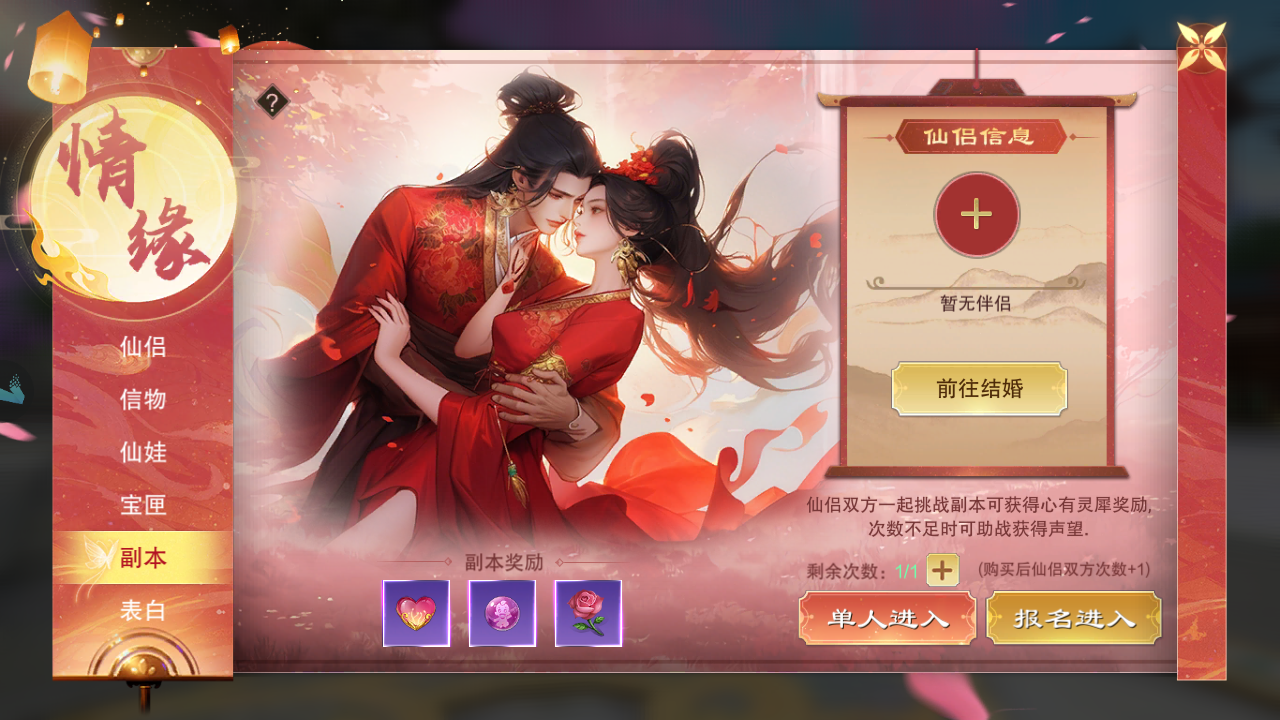 与仙侣一同挑战副本,不仅能增进彼此之间的默契与感情,还能获得“心有灵犀”奖励。