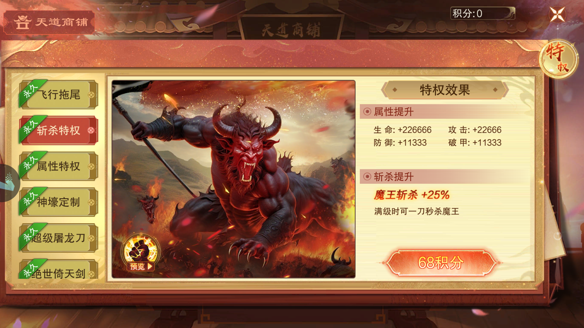核心亮点:魔王斩杀伤害+25%,满级一刀秒杀,刷怪升级两不误。