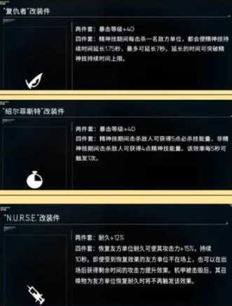 四件套:恢复友方单位耐久可使其攻击力+15%,持续10秒,即使受到恢复效果的友方单位不在场上,也可以在出场后获得剩余时间的攻击力提升效果,机甲被击毁后,其召唤物为友方单位恢复耐久时将不在不触发该效果。