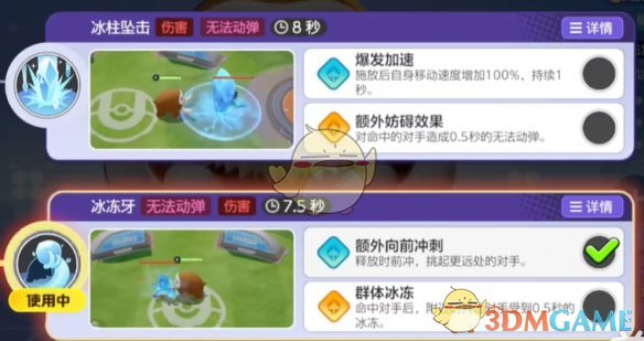 在指定地点降下冰柱,对范围内的对方宝可梦造成伤害并在短时间内降低其移动速度。短暂延迟后,该地点中心将落下障碍冰柱井造成伤害,障碍冰柱被强化普通攻击、地震命中或在一段时间后原地破碎并再次造成伤害,同时使范围内被命中的对方宝可梦在短时间内陷入冰冻状态,持续一定时间。
