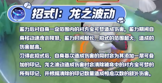 习得此招式后,自身每次造成伤害的同时会为其添加一层可叠加的印记。龙之波动造成伤害时会清除被命中的对方宝可梦的所有印记,并根据清除的印记数量造成相应次数的额外伤害。