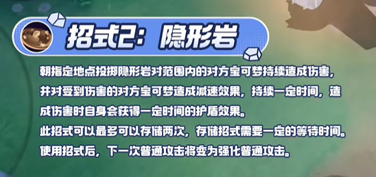 朝指定地点投掷隐形岩,对范围内的对方宝可梦持续造成伤害,并对受到伤害的对方宝可梦造成减速效果,持续一定时间,造成伤害时自身会获得一定时间的护盾效果。