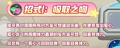 皮可西对周围所有对方宝可梦造成伤害,并使其发出爱心。爱心会飞向周围体力最低的友方宝可梦,回复其体力。