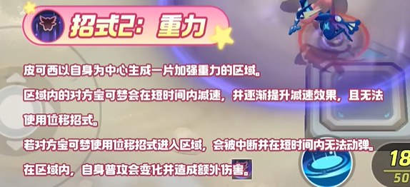 皮可西以自身为中心生成一片加强重力的区域。区域内的对方宝可梦会在短时间内减速,并逐渐提升减速效果,且无法使用位移招式。若对方全可梦使用位移招式进人区域,会被中断并在短时间内无法动弹。
