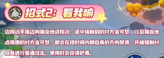 边挥动手指边向指定地点移动,途中接触到的对方宝可梦。以及指定地点周围的对方宝可梦。都会在短时间内朝自身的方向聚集,并被强制对自身进行普通攻击。使用时会获得护盾。