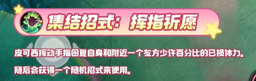 皮可西挥动手指回复自身和附近一个左方少许百分比的已损体力。随后会获得一个随机招式来使用。