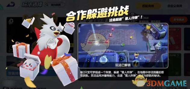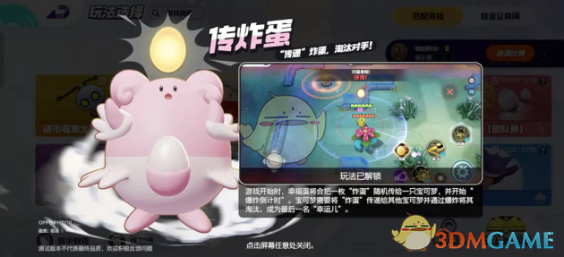 2、玩法简介:游戏开始时,幸福蛋将会把一枚“炸蛋”随机传给一只宝可梦,并开始“爆炸倒计时”。宝可梦需要将“炸蛋”传递给其他宝可梦并通过爆炸将其淘汰、成为最后一名“幸运儿”。