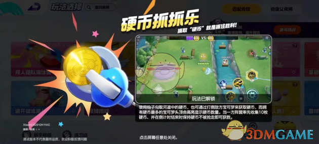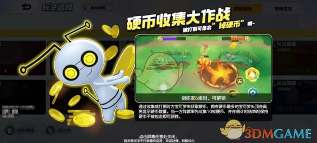 2、玩法介绍:地图中央会随机刷新硬币,训练家双方将在地图中央争夺硬币,通过拾取,击杀抢夺,率先,收集十枚硬币以上并坚持二十秒即可胜利,需注意,进入二十秒倒计时时,双方会获得一个加速buff,拾取硬币会回复一定血量,但会短暂降低移速,并且训练家被击杀时,手中的硬币将会掉落。