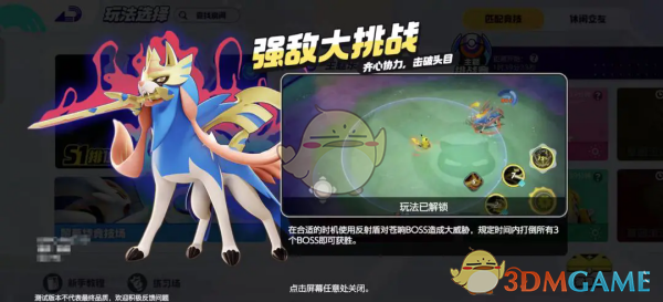 2、玩法简介:在强敌大挑战中,3只因亿奥斯能量的力量变得强大的头目宝可梦会接连登场,需要在规定时间5分钟内打倒它们。