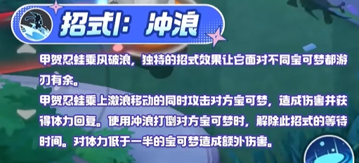 甲贺忍蛙乘上激浪移动的同时攻击对方宝可梦,造成伤害井获得体力回复。使用冲浪打倒对方宝可梦时,解除此招式的等待时间。对体力低于一半的宝可梦造成额外伤害。