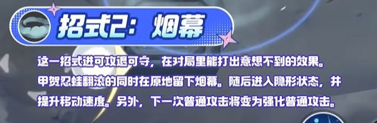 甲贺忍蛙翻滚的同时在原地留下烟幕。随后进入隐形状态,并提升移动速度。另外,下一次普通攻击将变为强化普通攻击。