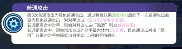 第3次普通攻击为强化普通攻击,通过特性效果回复体力后的下一次普通攻击会变为强化普通攻击,对对手造成180(+80%特攻)伤害。
