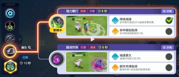 再次使用招式时会向指定方向冲刺,对对方宝可梦造成伤害,撞到挂酸液炸弹的对方宝可梦还会额外造成击飞和范围伤害。