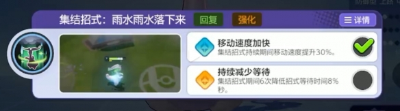 黏美龙使自身周围下雨,每0.5秒回复自身体力,持续6秒。在效果持续期间,所有普攻都会变为强化普攻。