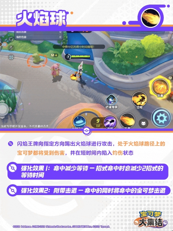 闪焰王牌向指定方向踢出火焰球进行攻击,处于火焰球路径上的宝可梦都将受到伤害,并在短时间内陷入灼伤状态