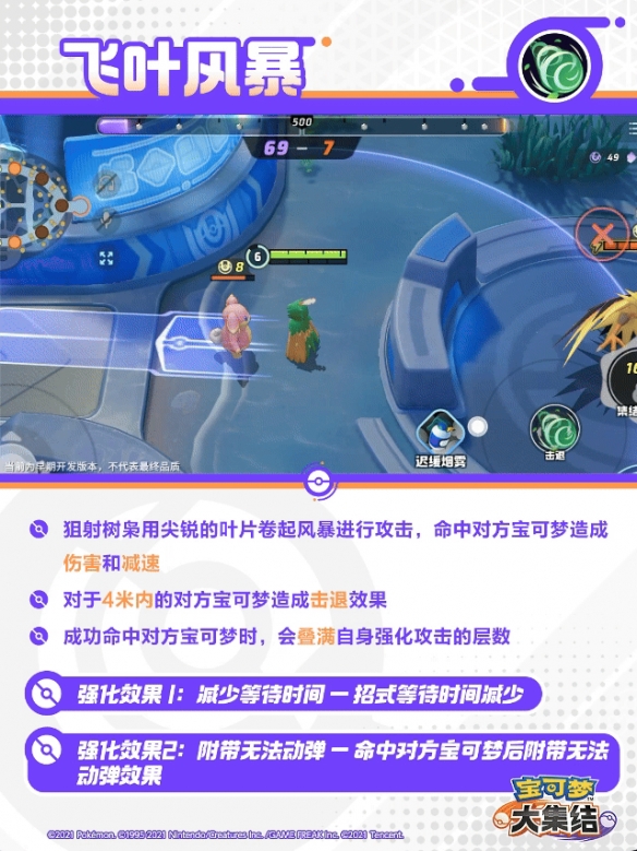 狙射树枭用尖锐的叶片卷起风暴进行攻击,命中对方宝可梦造成伤害和减速。
