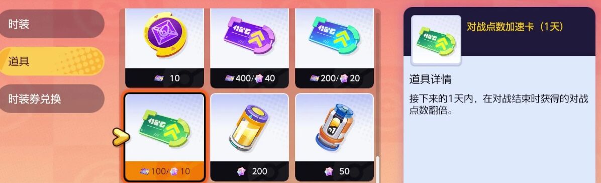 加速卡主要作用是可以帮助玩家快速获得对战点数奖励。在使用加速卡后,玩家在一天内的对局都将获得双倍对战点数。