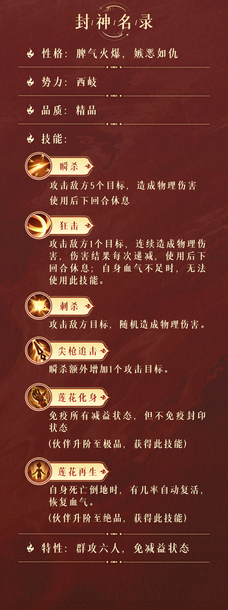 本篇给大家带来了《封神幻想世界》哪吒技能图鉴!在游戏里哪吒是精品级别的物理系伙伴,不仅能打出不俗的AOE物理伤害,拥有着同时群攻六人的能力,是不可或缺的物理系输出伙伴!免减益状态的他,面对一些debuff队伍毫不畏惧!关键时刻还能复活扭转战局!大人们只需合理规划好休息回合,定能助大人在对局中百战百胜!凭借着多年的降魔经验,在封神大战中成果显著的哪吒,在游戏中可由精品升至绝品。
