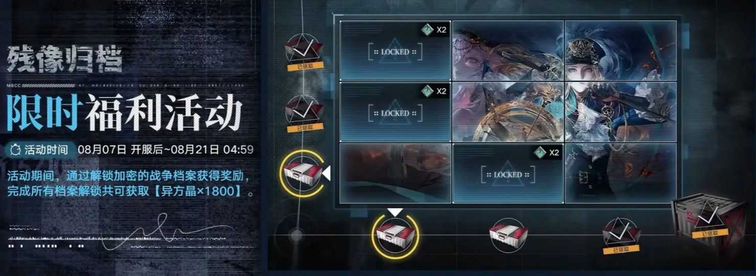 最后,还有“残像归档”限时福利活动,它为玩家们准备了丰富的奖励,包括异方晶x1800。在活动期间,通过解锁加密的战争档案,你将一步步接近更多奖励。活动时间较短,想要拿到这些奖励的小伙伴可得抓紧了。