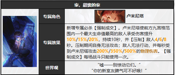 卢米尼塔释放【镇宅条款】时,每【眩晕】一个敌人,自身获得防御65%的护盾(最高叠加至自身防御的1300%),每次必杀最多生效三次。