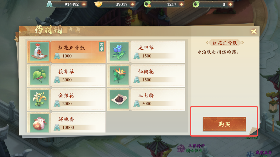 对话后得知需要红花正骨散,药材商人这里就有,点击购买药材,默认第一个就是,点击购买就好