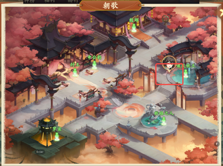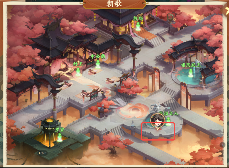 1、前往朝歌如图所示位置与跃跃对话,对话后得知想要有人陪他玩捉迷藏,在可以休息睡觉的地方藏着