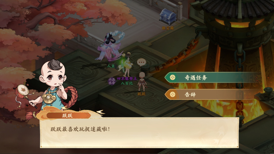 2、来到图示位置与跃跃对话,对话后跃跃要藏到可以祭拜的地方