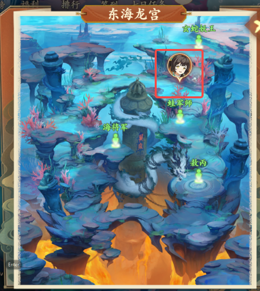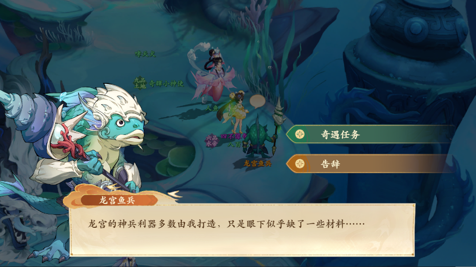 1、前往东海龙宫如图所示处与龙宫鱼兵对话,需要前往西岐购买精铁,接取任务