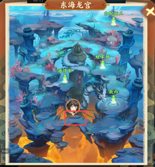 1、前往东海龙宫如图所示位置与龙宫侍女对话得知定海针下有奇怪声音,领取任务