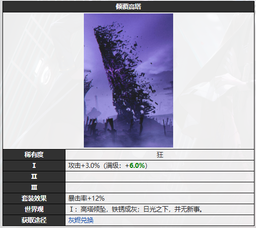 在《无期迷途》的各个烙印中倾覆高塔烙印的效果是能够让战斗中携带的禁闭者获得暴击率+12%,接下来就由小编给大家带来了详细的《无期迷途》倾覆高塔烙印图鉴,希望这篇文章可以帮到大家,大家一起来看看吧!