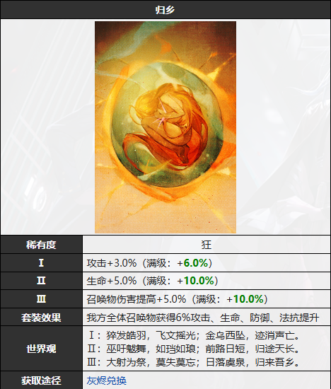 套装效果我方全体召唤物获得6%攻击、生命、防御、法抗提升