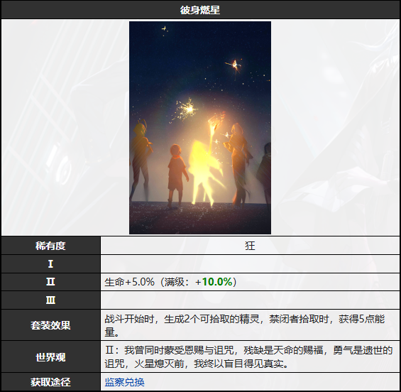 套装效果战斗开始时,生成2个可拾取的精灵,禁闭者拾取时,获得5点能量。