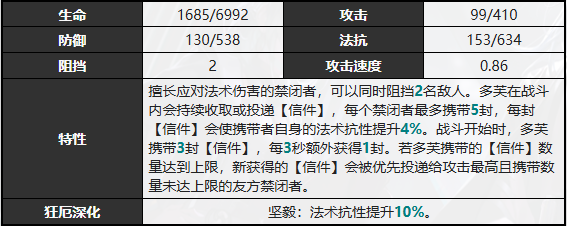 狄斯城外迪希尔小镇的居民之一,在镇上承担邮差职责,负责运送、分发信件,位于镇民人际网和消息网中的核心位置,疑似与小镇掌控组织存在暗中联系。接下来就由小编给大家带来了详细的《无期迷途》多芙技能介绍,大家一起来看看吧!