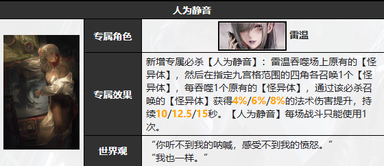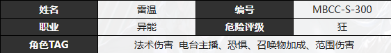 著名电台主持人,其栏目《凌晨三点的来电》在其任主持人期间,一度成为新城收听率最高的节目之一。后因该节目和对象牵涉数十起失踪案件,并引发恶劣狂厄外溢事件,影响听众精神意识,范围甚大,甚至影响生命安全,因此被断为需立即收容对象。接下来就由小编给大家带来了《无期迷途》雷温技能介绍。