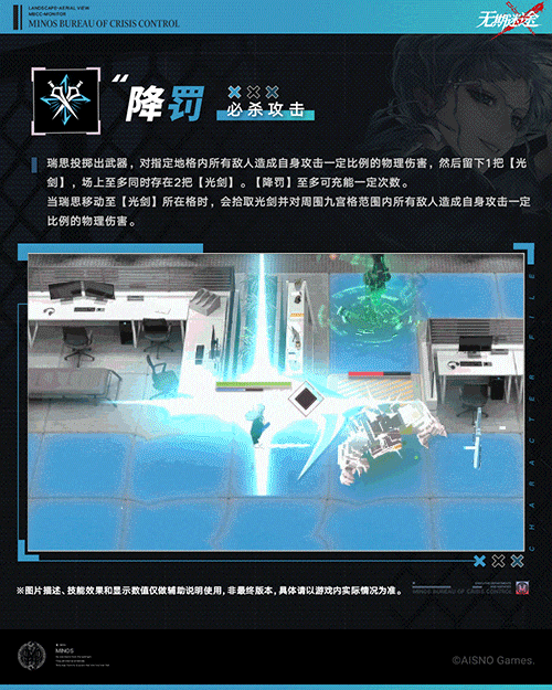 解锁第二必杀【恶行尽除】。瑞思瞬移经过并引爆场上所有【光剑】,对每把【光剑】周围九宫格范围内所有敌人造成自身攻击一定比例的物理伤害与一定核心伤害。