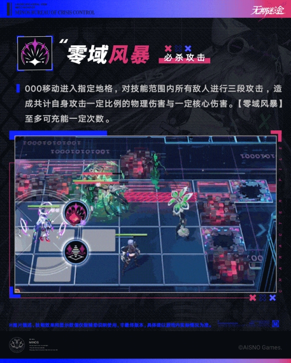 000移动进入指定地格,对技能范围内所有敌人进行三段攻击,造成共计自身攻击一定比例的物理伤害与一定核心伤害。